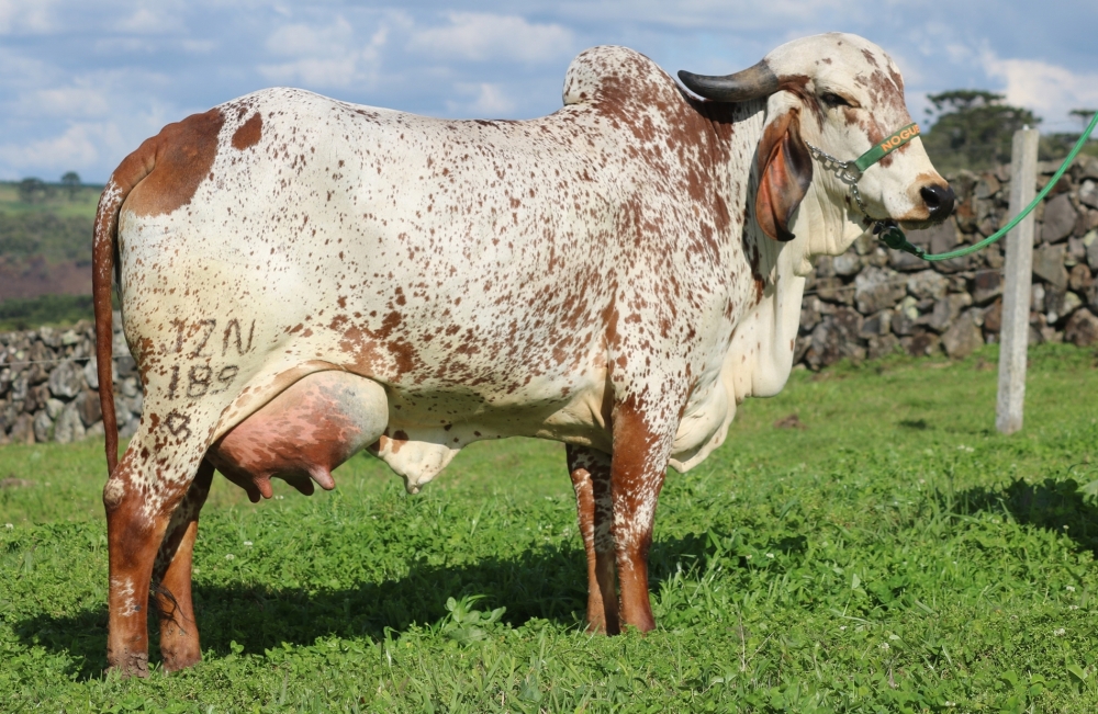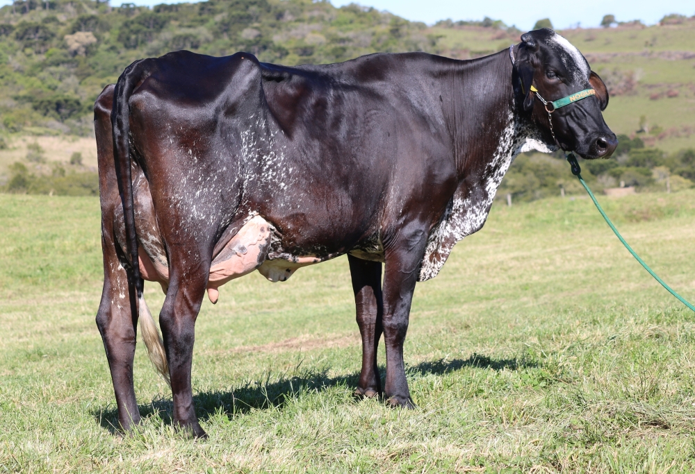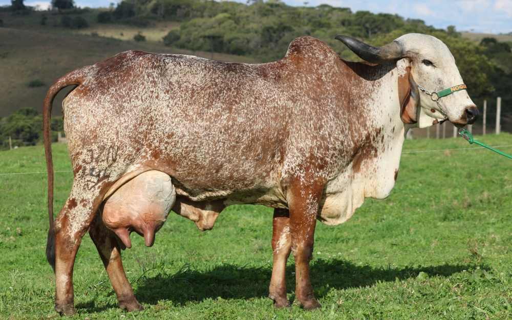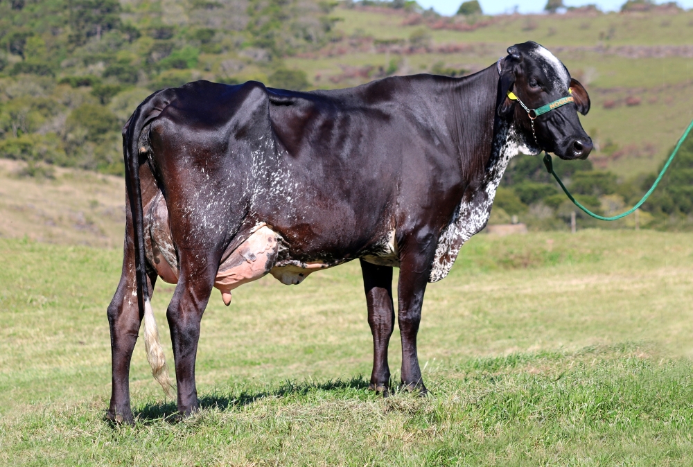 Destaque da geração de 2021 de fêmeas Girolando ½ sangue. Na linha paterna, “View-Home Monterey-ET”, conceituado reprodutor da raça Holandesa para as características de tipo (conformação). Na linha materna, uma das principais matrizes Gir Leiteiro da Fazenda das Nogueiras, “Havana FIV das Nogueiras” (JZN 144), grande campeã da Expointer 2021 e mãe de várias fêmeas classificadas entre as top 10% para produção de leite na avaliação genômica nacional do Gir Leiteiro. “Lila” representa o biotipo moderno de Girolando que buscamos: Garupa com excelente nivelamento e sistema mamário raso, com fortes ligamentos e muito bem aderido, com destaque para a largura, altura e convexidade dos seus quartos posteriores. Ademais, “Lila” possui PTA leite de 1030kg no Programa de Melhoramento Genético do Girolando (PMGG) em 2025, confirmando a prepotência genética de sua mãe também na produção de animais ½ sangue.